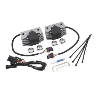 Laut Accel sind dies die besten Performance Spulen mit coolster Optik auf dem Markt. Dadurch, dass die Zündspulen hier im Steckergehäuse integriert sind, entfallen sowohl die Zündspule als auch die Zündkabel da sie direkt auf der Zündkerze montiert werden. Ein wunderschönes Aluguss-Cover beinhaltet die Spule und sorgt für Wärmeableitung weg vom Zylinderkopf. Die Verkabelung ist für den Custom Look ordentlich in den Kühlrippen versteckt. Erhältlich in schwarz oder silber, passend zur Motorfarbe.